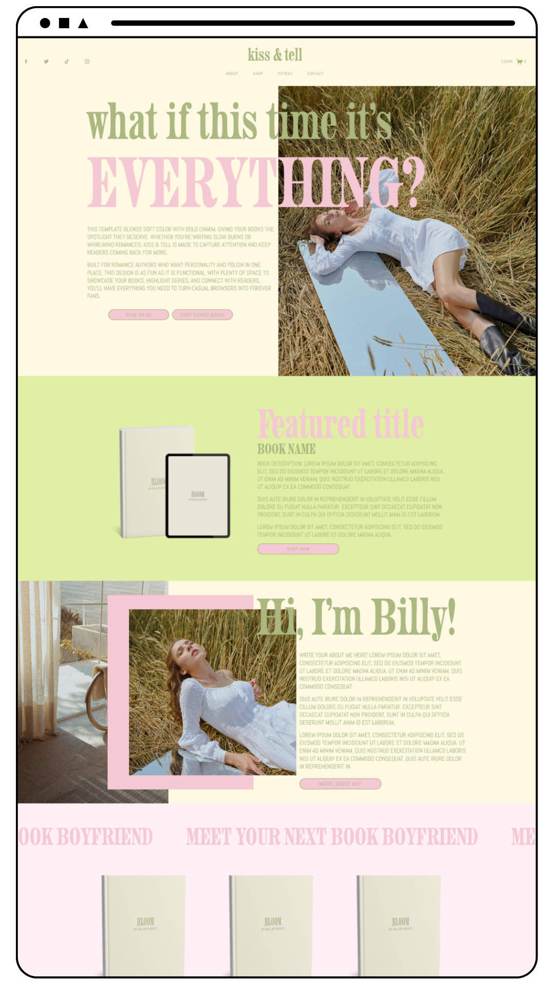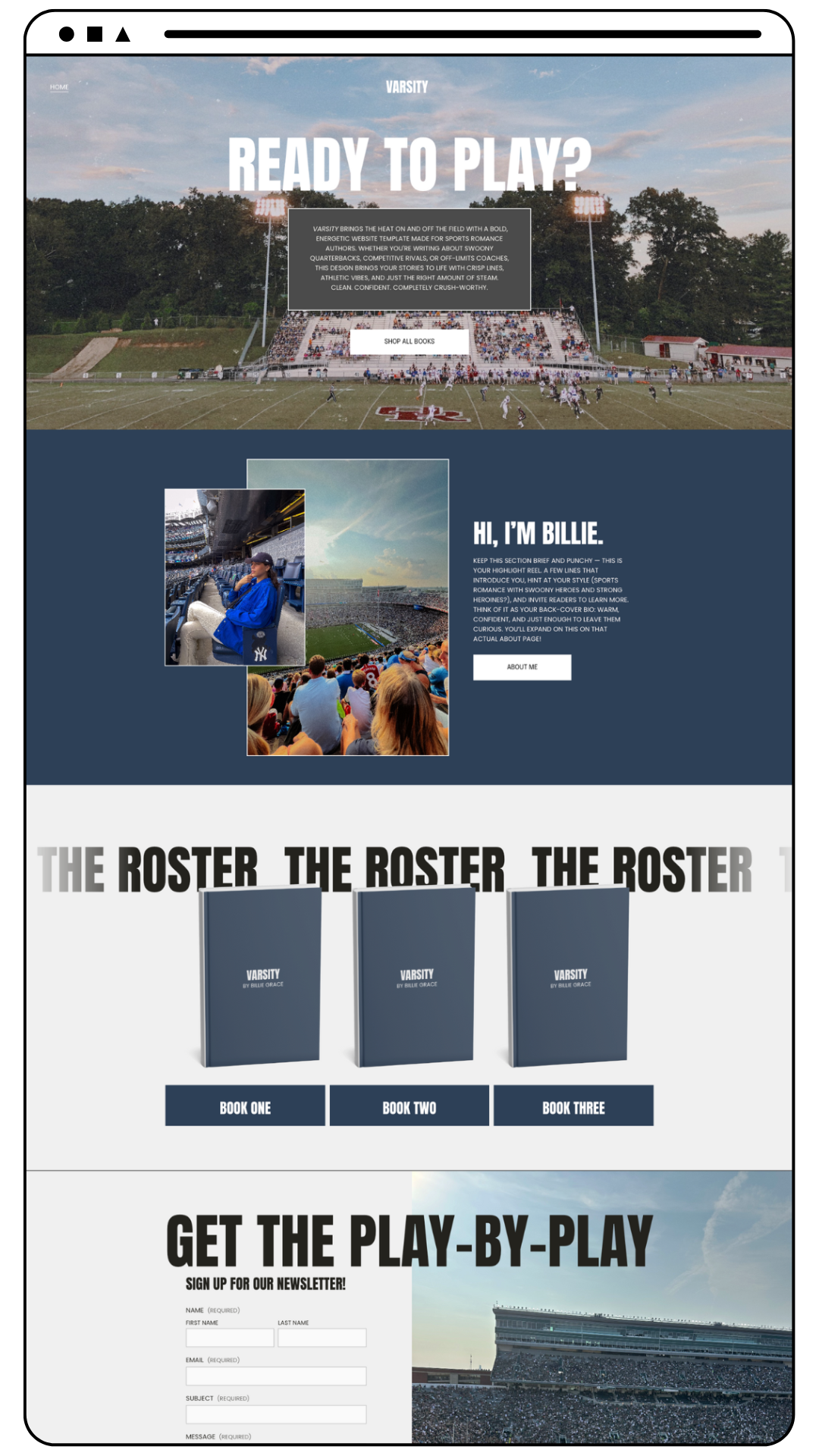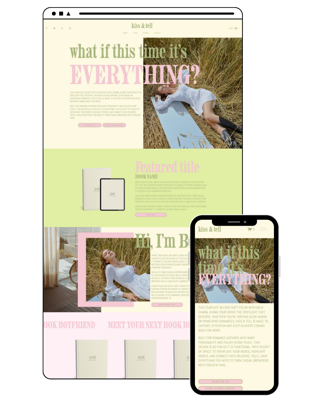 A complete Squarespace 7.1 template, professionally styled and structured for romance authors, with fonts, colors, and layouts curated to capture your unique voice.
