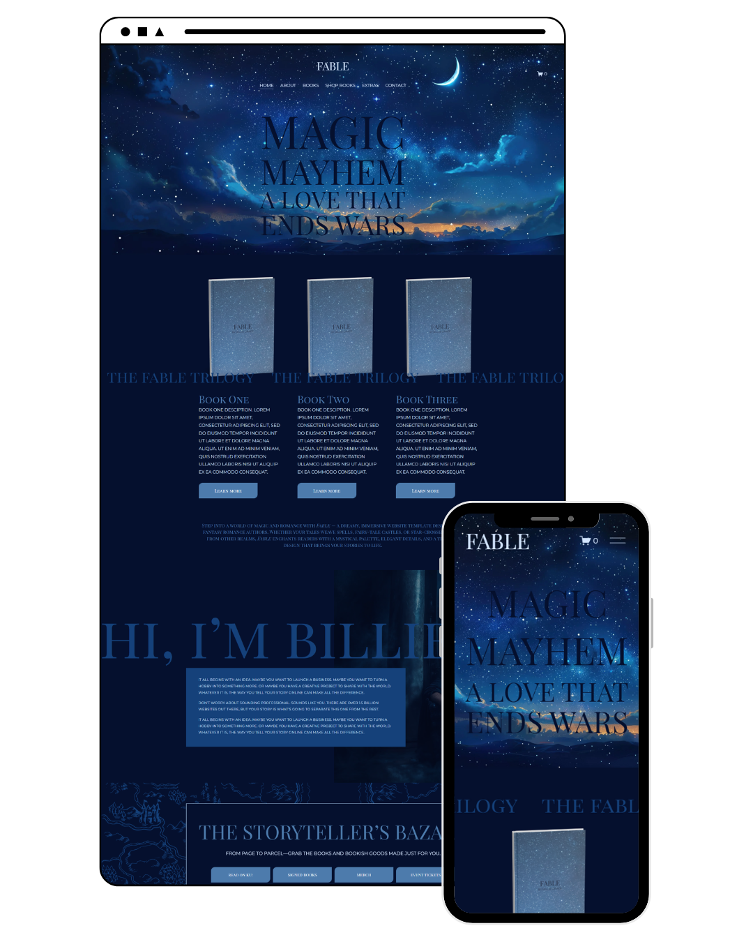 Comes with ready-to-edit Home, About, Books or Shop, Extras, and Contact pages — everything you need to launch a polished, reader-friendly website.